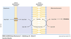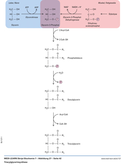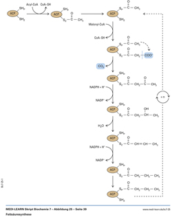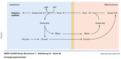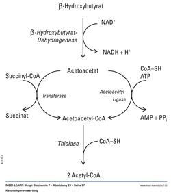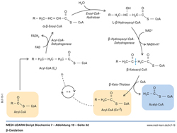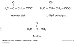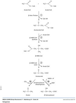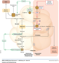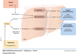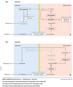Ursachen gesteigerter Ketonkörperbildung. Dargestellt ist eine Leberzelle. a) Hungerzustand (mittelfristig) nach Verbrauch der Glykogenvorräte