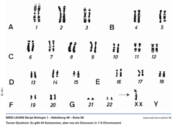 Turner-Syndrom: Es gibt 44 Autosomen, aber nur ein Gonosom (= 1 X-Chromosom)