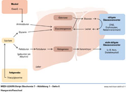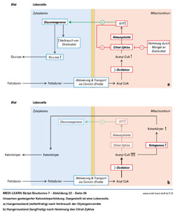 Ursachen gesteigerter Ketonkörperbildung. Dargestellt ist eine Leberzelle. a) Hungerzustand (mittelfristig) nach Verbrauch der Glykogenvorräte b) Hungerzustand (langfristig) nach Hemmung des Citratzyklus
