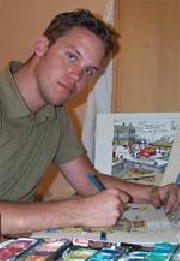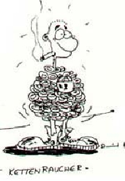 Bis zum Abitur 1995 habe ich also an fast jedem Thema meine zeichnerische Duftmarke hinterlassen, während der Oberstufe keimte ein weiteres Projekt - die schulübergreifende Zeitung "Giftzwerg" - auf; auch hier war ich neben gelegentlichen Artikeln hauptsächlich für Illustrationen und Cartoons zuständig. Der Cartoon "Kettenraucher" ist einer der älteren - ich glaube von 1991 oder so... Ältere Sachen müssen bei diversen Umzügen oder Ausstellungen verloren gegangen sein.