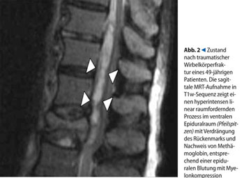 Die zunehmende Verfügbarkeit der MDCT sowie der Anspruch an eine kurze Untersuchungszeit und eine hohe diagnostische Sicherheit führten in den letzten Jahren zu einer zunehmenden Bedeutung dieser Modalität, die inzwischen als Methode der Wahl bei Wirbelsäulenverletzungengilt (s. Abb. 1). Nachteil jeder Bildgebung mittels CT, wie eine höhere Strahlenbelastung und höhere Kosten, bedürfen jedoch einer differenzierten Abwägung. Patienten mit einer offensichtlichen neurologischen Klinik sowieschweren Wirbelsäulentraumata sollten unbedingt einer CT-Untersuchung zugeführtwerden, während für Risikogruppen mit geringer Verletzungswahrscheinlichkeit eine konventionelle Röntgendiagnostik ausreichend erscheint bzw. auf eine differenzierte radiologische Abklärungverzichtet werden kann. Bei neurologischen Defiziten ohne erkennbare Ursache auf vorangegangenen Röntgen- oder CT-Aufnahmen, bei unklaren Befunden und insbesondere zur Klärung möglicher diskoligamentärer Verletzungen, kann die MRT weitere Erkenntnissezum Verletzungsausmaß nach einem Wirbelsäulentrauma erbringen(s. Abb. 2). Die Detektion diskoligamentärer Läsionen ist zur Einschätzung derposttraumatischen Wirbelsäulenstabilitätwichtig und sollte durch die MRT zuverlässigerfolgen.