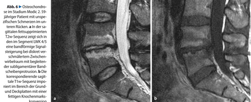 Die Szintigraphie weist im Frühstadium eine hohe Sensitivität für entzündliche Prozesse auf und kann in unklaren Fällen zur Diagnosefindung beitragen, wenn eine MRT nicht möglich ist. Zu den entzündlichen Erkrankungen der Wirbelsäule zählen differenzialdiagnostisch Erkrankungena us dem rheumatischen Formenkreis wie die rheumatoide Arthritis und die seronegativen Spondylarthropathien (u.a. ankylosierende Spondylitis, Reiter-Syndrom, Sjögren-Syndrom, SAPHO-Syndrom, systemischer Lupus erythematodes, Psoriasisarthritis, Sklerodermie, Dermatomyositis, „mixed connectivetissue disease“), welche eine unterschiedlicheklinische Symptomatologie bei radiologisch ähnlichem Erscheinungsbild aufweisen. Der interessierte Leser sei hierbei auf die Artikel von Dihlmann et al. verwiesen.