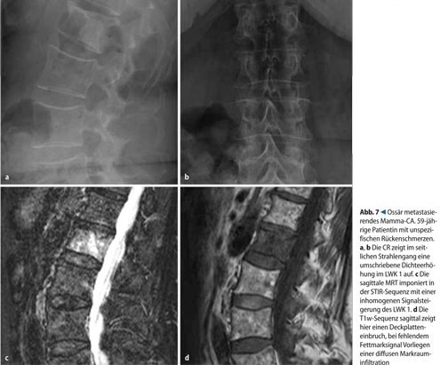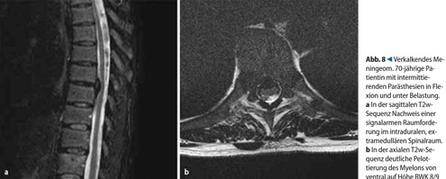Sie besitzt die höchste Sensitivität zum Nachweis tumoröser und entzündlicher Prozesse und wird zur Klärung von Ausbreitung und Beziehung fraglicher Raumforderungen zu den intraspinalen Strukturen eingesetzt als auch zum Staging und zu Verlaufskontrollen primärer Wirbelsäulentumoren. Eine Zuordnung der intraspinalen Raumforderung zu einem der drei Kompartimente extradural, intradural-extramedullär oder intradural-intramedullärwird in der Regel erst durch die MRT ermöglicht (s.Tab. 4,. Abb. 7, 8).