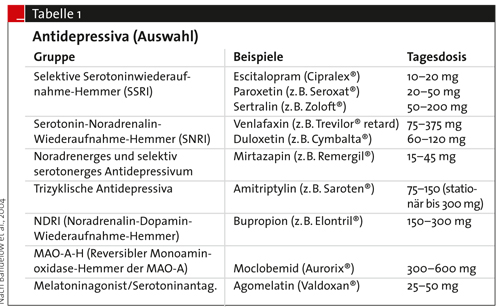 Depressionen werden vorwiegend mit Antidepressiva und Psychotherapie behandelt, wobei diese synergistisch wirken. Antidepressiva können durchaus in der Hausarztpraxis eingesetzt werden (Tab. 1). Neuroleptika werden nur als Komedikation mit Antidepressiva bei wahnhafter Depression verwendet. Benzodiazepine sollten, wenn überhaupt, nur kurzfristig zur Überbrückung der Zeit bis zum Wirkeintritt der Antidepressiva oder bei Suizidalität eingesetzt werden; sie haben keine antidepressive Wirkung. In manchen Fällen hilft eine Wachtherapie (Schlafentzug). Die Wirkung der Lichttherapie ist umstritten. Neuere Methoden wie die repetitive transkranielle Magnetstimulation sind noch nicht etabliert, da ausreichende kontrollierte Studien bislang fehlen.