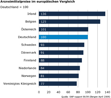Um eine Einschätzung für das Preisniveau in verschiedenen Ländern zu bekommen, sind systematisch Preisvergleiche quer durch das Arzneimittelsortiment aussagekräftiger als das Vorführen von willkürlich gewählten Einzelbeispielen. Einen solchen systematischen Preisvergleich hat das Forschungsinstitut SNF2009 für das norwegische Gesundheitsministerium erarbeitet. Hier zeigt sich, dass Arzneimittel in Deutschland nicht teurer als in vielen anderen Industriestaaten sind. Die deutschen Preise sind vielmehr im Mittelfeld der verglichenen Länder, gleichauf mit Österreich, Schweden und Dänemark. Untersucht wurden die Preise von Medikamenten mit den 200 meist verkauften Wirkstoffe in zehn europäischen Staaten.