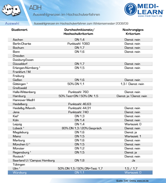 Die Wartezeit um ein Studium der Medizin zu beginnen betrug zum Wintersemester 2008/09 10 Semester. Wer genau 10 Semester vorzuweisen hatte, benötigte zudem noch einen Abiturschnitt von 2,8. Bei der Verteilung der über die Wartezeit ausgewählten Bewerber auf die Studienorte sind zuerst deren Wünsche maßgeblich. Wenn nicht mehr alle Bewerber, die eine Hochschule an gleicher Stelle genannt haben, zugelassen werden können, entscheiden Sozialkriterien über die Zulassung.