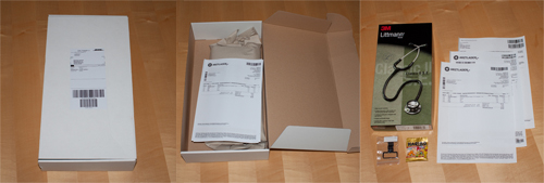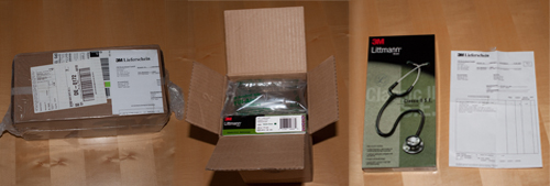 3M lieferte das bestellte Stethoskop zum Preis von EUR 119,69 (inkl. Versand) auf Rechnung innerhalb von fünf Tagen per DPD. Die Ware war sicher verpackt, der Karton wurde zusätzlich in eine Plastik-Folie eingeschweißt (aus Umweltschutzgründen sicher überdenkenswert). Der Lieferung lag ein Lieferschein bei. Die Rechnung folgte einen Tag später per Post. Die Reaktion von 3M auf zwei Widerrufs-Mails erfolgte 16 Tage später in Form einer Mahnung – die Tester waren hier etwas verwundert. Nach einer weiteren E-Mail wurde der Widerruf jedoch schließlich noch akzeptiert. Einen Rücksendeschein gab es nicht. Die Kosten für die Rücksendung wurden von 3M nicht erstattet.
